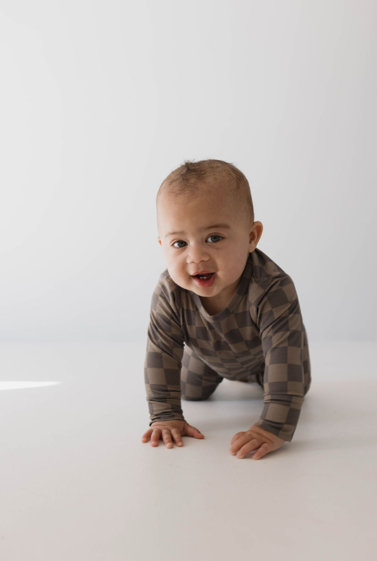 Sleep easy with the faded brown checkerboard sleepy-time set! Crafted with bamboo and featuring a cozy two-piece design, this adorable lounge set will keep your little one comfy and secure. it's the perfect choice for a night full of sweet dreams or a day of adventure! 0-6 Months (Footed ) 6-24 Months (Footless) Material : 95% bamboo viscose / 5% spandex A key benefit of bamboo clothing is that it is naturally hypo-allergenic, gentle on the skin, and highly breathable. It keeps skin cool in summer and warm in winter by wicking away any excess moisture. No need for both summer and a winter wardrobe – with bamboo clothing your babe will be comfortable year round. Care Instructions : Wash with like colors Tumble dry on low or hang dry